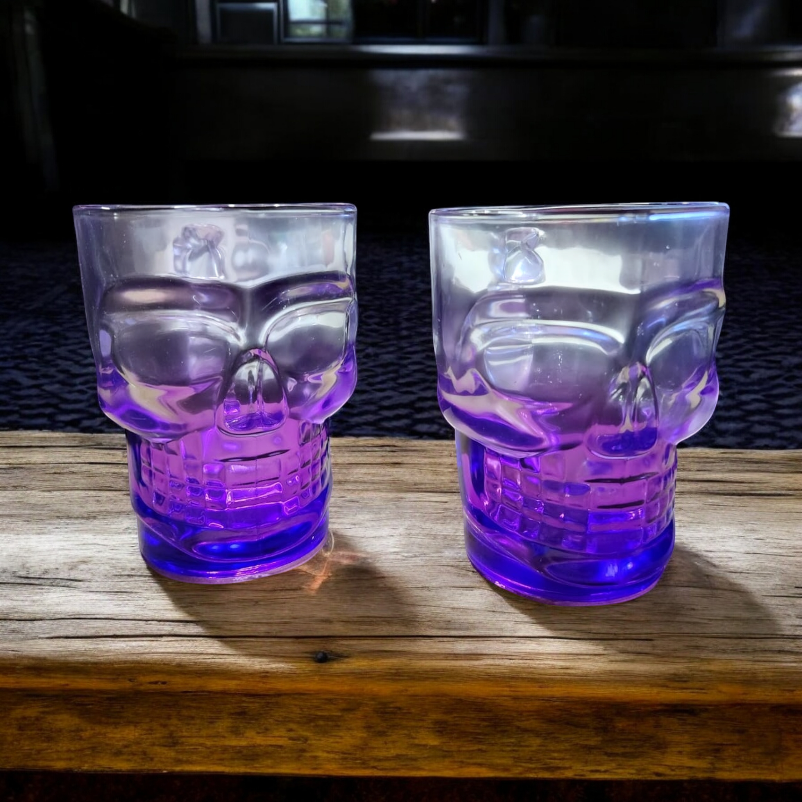 PRECIO POR SET JUEGO DE 2 VASOS MORADO CALAVERA 9.5X13CM VIDRIO (VENTA MINIMA 2 UNIDADES