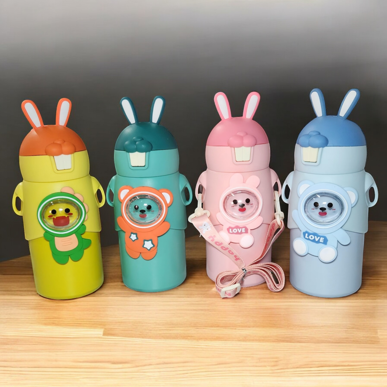 TERMO 500ML FIGURA CONEJOS Y CORREA DECORATIVA